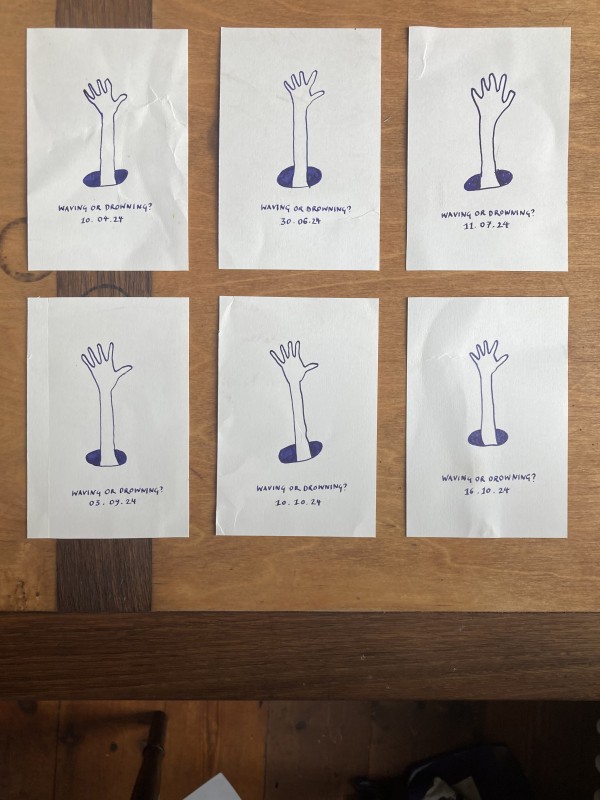 There’s a photo I found of a woman’s hand outstretched through a broken pane of glass. I thought about that photo a lot, so I started drawing it. Sometimes it looks like the hand is waving. Sometimes it looks like the hand is drowning. I thought of Stevie Smith’s poem, Not Waving But Drowning. Look it up.